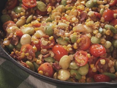 Place a large skillet over medium heat, then add the bacon and cook until the fat has rendered and the bacon has crisped, about 10 minutes. Add the tomatoes, garlic and onions and cook until the onions have softened a bit, about 5 minutes. Add the corn and cook another 2 minutes. Add the lima beans and then remove from the heat. Stir in the basil and red wine vinegar, season with salt and pepper and serve.