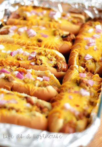 Ladle 1/3 cup of chili onto each hot dog, and then sprinkle with shredded cheddar cheese and onion.