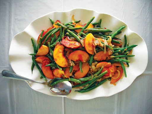 Bring a 6-qt. saucepan of salted water to a boil; add beans and cook until crisp-tender, 1-2 minutes. Transfer to a bowl of ice water until chilled. Drain and add to peach mixture; toss to combine.
