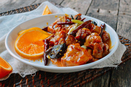 Heat a wok over medium heat and add a tablespoon of oil. Add the dried chili peppers, tangerine peel, and star anise, and toast for about 20 seconds, being careful not to burn the aromatics. Add the orange juice, chicken stock, vinegar, sugar, and soy sauce.