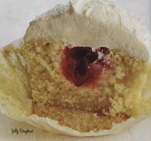 3. For Jelly Doughnut: Make Vanilla Cupcakes; cool. Fill a pastry bag (with a large tip) with 1/2 cup seedless raspberry or strawberry jam. Insert into the top of the cupcakes and pipe in the jam. Frost with Vanilla Frosting; top with sanding sugar or sprinkles.