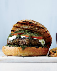 Transfer 1/4 cup of the pesto to a bowl. Add the ground chuck and ground sirloin and a pinch of salt and gently knead to blend. Form the mixture into six 4-inch patties, about 3/4 inch thick. Brush the burger patties lightly with olive oil.
