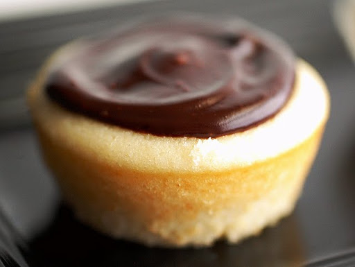 To assemble cupcakes, scoop out a tiny bit of cake from the center of each cupcake and place a spoonful of custard into the center. Spoon and spread chocolate ganache on top of cupcakes.