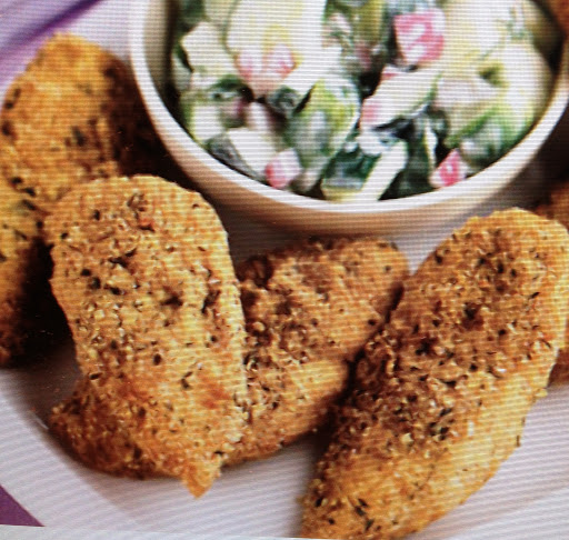 Preheat the oven to 425 degrees F. Set a rack on a rimmed baking sheet and coat with cooking spray. Toss the chicken with the olive oil in a large bowl, then add the falafel mix and toss to coat. Arrange the chicken on the rack and bake until golden and cooked through, about 10 minutes. While the chicken is baking, stack the pita halves and wrap them in foil; warm in the oven, about 5 minutes.