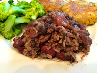 This Food Network recipe is delicious, and truly better than the far less healthy white rice version. Plan on at least 45-50 minutes for cooking the brown rice, but it can be done in advance. It will be warmed up when added to the hot bean and sausage mixture. For a more cajun version, substitute andouille sausage. As given, the recipe serves 8; our version (using less rice) serves 3-4, and the flavor and texture proportions were perfect. (Photo is my own.)