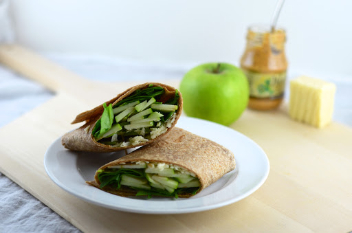 Spread tortilla with mayo (in calorie count) or honey mustard. Add greens and top with apple and cheese. Wrap tightly and cut in half.