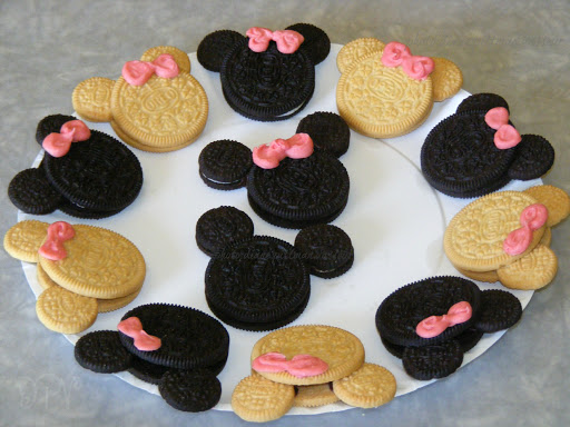 - For each "mouse" you will need 1 large sandwich cookie and 1 mini sandwich cookie. (The Minnie and Mickey in the center of plate uses 1 large cookie and 2 minis, edges are attached with melted chocolate.)