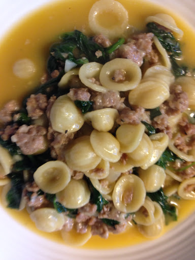 2.Pour chicken broth into sausage mixture and bring to a boil while scraping the browned bits of food off of the bottom of the pan with a wooden spoon. Add orecchiette pasta; cook for 12-15 minutes.