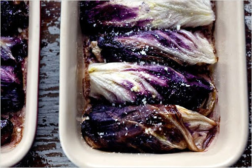 1. Preheat the oven to 350 degrees. Oil or butter a two-quart gratin or baking dish. Bring a medium pot of water to a boil. Fill a bowl with ice water. When the water comes to a boil, salt generously and add the radicchio leaves. Blanch for two minutes, then transfer to the ice water. Drain and dry on paper towels.