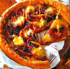 4. Espolvorear la base de la pizza con el queso cheddar rallado; encima, poner el salami, la cebolla morada, las aceitunas y el pimiento asado. Hornear 30 ó 40 minutos, o hasta que la masa se cueza. Colocar encima rebanadas finas de queso bocconcini y hornear 5 minutos más, o hasta que se derrita
