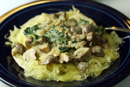 14) Using a fork, gently scrape at the flesh of the squash. Serve the sauce right over the spaghetti squash, just like pasta!
