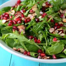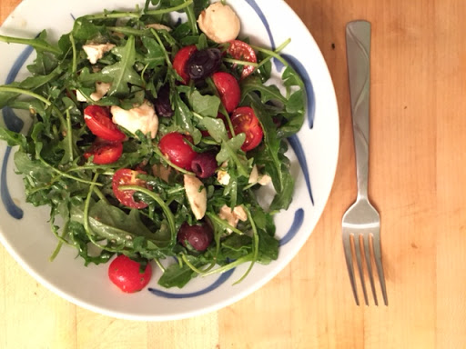 Salad: Place desired amount of dressing in bottom of bowl, add arugula, and top with cherry tomatoes and Italian olives.