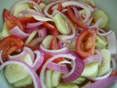 Peel and slice cucumbers. Chop tomatoes and onion. Combine all in a large bowl. Mix up a dressing of equal parts Vinegar, Water, and Sugar. Pour over vegetables and refrigerate.