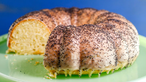 In a small bowl, whisk together powdered sugar and lemon juice to make the glaze. Once cake is cool, brush half of the glaze onto the cake using a pastry brush. Let the glaze sit for 15 minutes and then apply a second coat with the remaining glaze. While the glaze is still wet, sprinkle with poppy seeds.