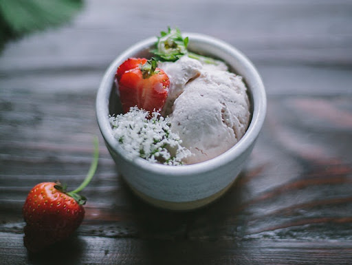 Strain the oak and vanilla bean husk out of the creamy mixture, reserving the creamy liquid and discarding the solids. Empty the liquid into a blender along with the roasted strawberries, honey, and vanilla extract. Blend until smooth, then refrigerate the mixture until thoroughly chilled, about 4 hours.