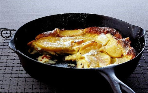 While apple is cooking, add milk, flour, eggs, granulated sugar, vanilla, and salt to butter in blender and blend until smooth.