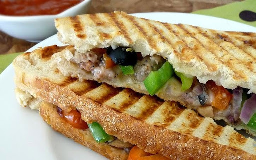 Preheat panini press. Place one slice of bread on a plate or cutting board to assemble the panini. Add 2-3 slices of cheese (depending on bread size) in a single layer. Add approximately a half a cup of the topping mixture followed by 2-3 more slices of cheese in a single layer.