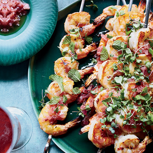 Light a grill or preheat a grill pan. Season the shrimp with Salt Black pepper and thread onto the skewers (don’t pack them on too tightly). Grill over high heat, turning once, until lightly charred and just cooked through, about 4 minutes total. Transfer to a platter and spoon the shrimp butter
