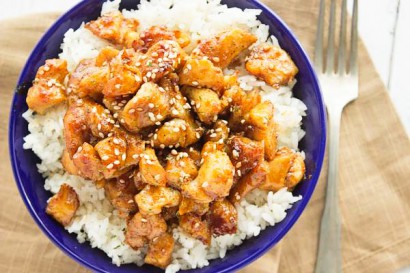 Add baked chicken to sauce and stir until combined. Let cook for a few minutes then serve immediately, garnished with green onions and sesame seeds.