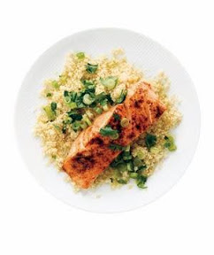 Meanwhile, in a small bowl, combine the cilantro, scallions, lemon juice, the remaining 2 tablespoons of oil, and 1⁄4 teaspoon each salt and pepper. Drizzle over the salmon and couscous.