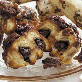 Flatten each biscuit to 1/4-in. thickness. Place a chocolate kiss on one side of each biscuit. Fold edges of dough over kiss; pinch edges to seal. Arrange biscuits, flat side down, over pecans.