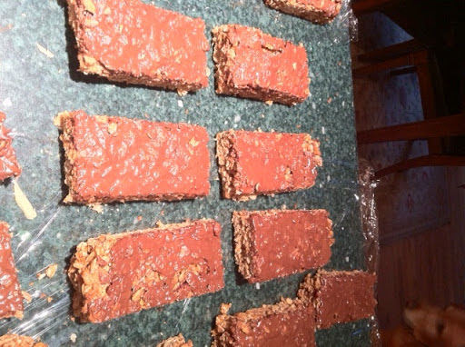 Melt butter. Add oil. Add to the oatmeal and put onto two cookie sheets and heat till toasty, 20-25 minutes @350*. Meanwhile heat the sugars and the salt just to boiling and remove from heat add the vanilla. In a large bowl add the nuts and the rest of the dry ingredients, then add the toasted oats. Toss to combine, then pour on the hot syrup. Mix well. Cover a cookie sheet with reynolds wrap and spray or butter it. Then add the granola mixture. Put one cookie sheet on top of the other and press really hard to compact the mixture. Now put it into the oven @ 325* for 25 minutes. If you choose to cover with the chocolate put the chips on now and shut into the oven for a few minutes. Remove and spread with spatula. Now cool completely. Cut into bars and wrap in plastic wrap to store.