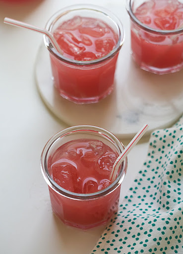 3. Repeat the blending and straining process with the remaining chopped watermelon. Transfer the watermelon juice to the refrigerator for 1 hour to chill. Divide the watermelon juice amongst glasses.
