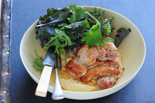 6. Divide sauce between 2 plates. Top with chicken and serve leaves on the side.