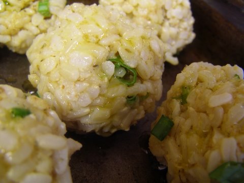 2. Using about 2 tablespoons rice mixture at a time, roll into balls and line up on a baking sheet. Tip: To make it easier to roll out the balls, rinse your hand with cold water every so often and keep them a little damp. If your hands are dry, the rice will stick to your hands instead of sticking together.
