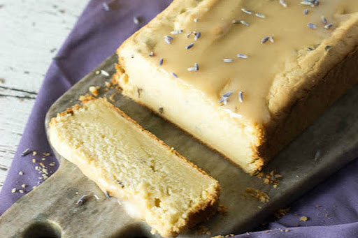 Once cake is cooled off to the touch, pour glaze over top and garnish with more lavender, serve!