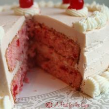 Meanwhile: Add butter to the bowl of a stand mixer fitted with the whisk attachment (or place in a large bowl and use and hand mixer). Beat butter until light and fluffy, about 3 minutes. Add sugar 1 cup at a time until it is all incorporated (beating between each addition). Add 3 ounces (6 tablespoons) maraschino cherry juice from the jar and beat until mixture is light and fluffy. Frost the cake with all of the icing and garnish with remaining cherries.