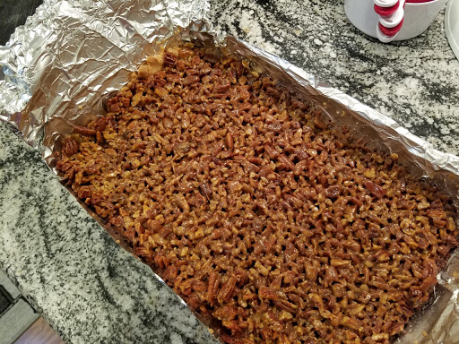 in a saucepan over medium-high heat. Stir in pecans, and pour hot