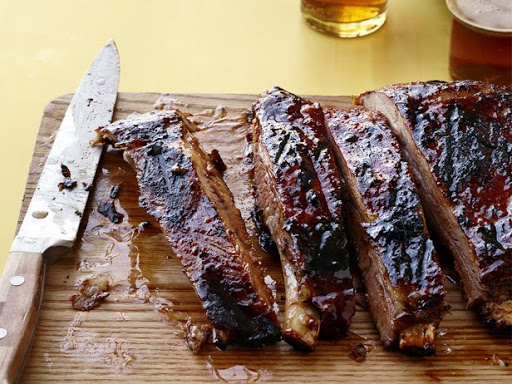 Preheat a grill to low heat on one side. Cook the ribs bone-side down on the cooler side of the grill, covered, until tender, about 2 hours 30 minutes. (If using a charcoal grill, add more charcoal as needed to maintain the temperature.) Continue to cook, uncovering every 10 minutes to baste with the sauce, until the ribs are glazed, about 40 more minutes. Remove from the grill and cut into pieces.