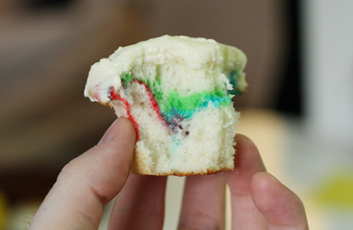 Finally I topped each cupcake off with more white mixture and then used a butter knife (or toothpick) to gently swirl the mixture. Just make two or three swirls. If you do more than that you will combine all the colors too much and end up with a purple filling. Not as fun.