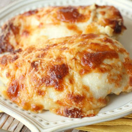 In a bowl mix mayonnaise, sour cream, ½ cup Parmesan cheese, salt, pepper and garlic powder. Spread this over chicken and sprinkle with remaining Parmesan cheese.