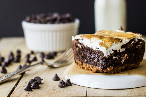 Brownie directions: Melt the chocolate chips and butter in a double boiler over medium heat until smooth. You can also melt in the microwave in 20 second intervals at a time stirring in between until smooth. Let mixture cool for 5 -7 minutes then add the brown sugar, granulated sugar, eggs and vanilla and mix until smooth. Carefully fold the flour into the chocolate mixture all at once. Fold it in nice and slow making sure not to over mix. Stop mixing as soon as you no longer see the white of the flour. Pour the brownie mixture on top of the graham cracker crust and bake at 350 degrees for 42 minutes. The brownies will continue to cook when you take them out of the oven so do not over bake if you want to have a perfect fudge-like brownie. Remove from the oven and place on wire rack. Let brownies cool slightly and while still warm top with the marshmallow Fluff.