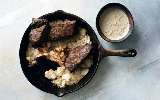 - FLATIRON STEAKS WITH CREAMY JUNIPER SAUCE AND HASH BROWNS