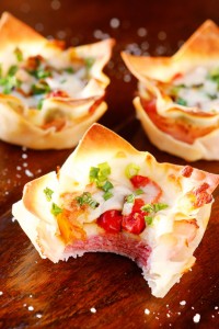 • Generously coat a standard size muffin tin with nonstick cooking spray. Line each cup with a wonton wrapper. Add a slice of ham, salami, and top with approximately 1 tablespoon shredded cheese into each cup.