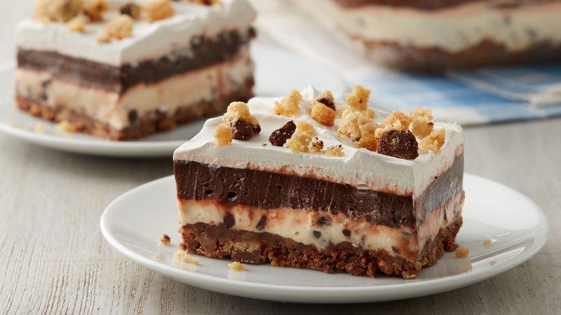 When ready to serve, crumble remaining 4 cookies; sprinkle cookies and remaining 2 tablespoons chocolate chips on top. Cut into 6 rows by 4 rows. Cover and refrigerate any remaining pieces.
