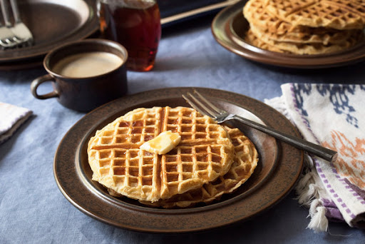 3. Preheat a waffle iron and, using a pastry brush or paper towel, lightly coat with butter. Cook waffles (using about 1/2 cup batter per waffle) until golden and crisp. Butter the iron in between batches as needed. Serve waffles immediately as they are ready, or keep them warm in a 200 degree oven until ready to serve.