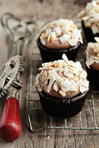 5. Frost your cooled cupcakes and garnish with toasted shaved coconut.