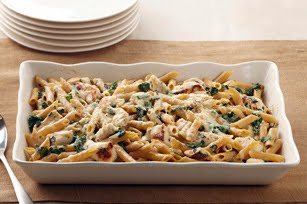 DRAIN pasta. Add to chicken mixture; mix lightly. Spoon half into 2-qt. casserole; top with 1/2 cup mozzarella. Repeat layers; sprinkle with Parmesan.