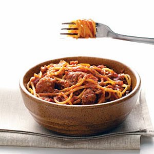 Nutrition Facts: 3/4 cup (calculated without spaghetti) equals 231 calories, 13 g fat (5 g saturated fat), 41 mg cholesterol, 778 mg sodium, 13 g carbohydrate, 3 g fiber, 15 g protein.