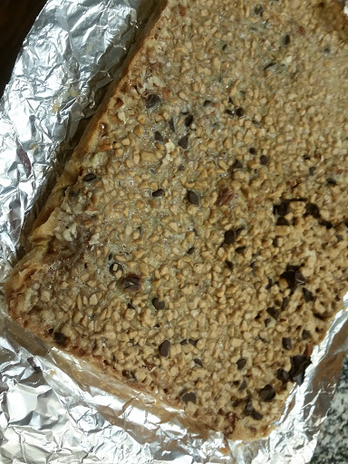 chocolate chips, and toffee pieces evenly over the filling. Bake until