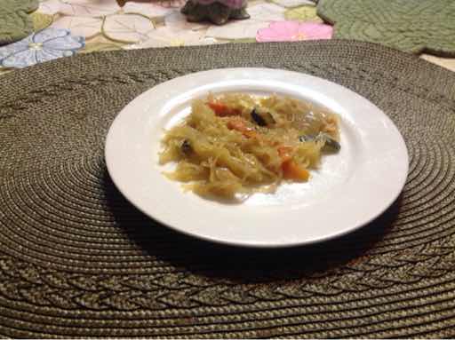 Prepar squash: cut in half spoon out seeds cook in oven face down about 1 hour at 350 till tender, let cool then with fork scrape spiegeleisen out now sauté in pan with veg mix in butter and word hire sauce
