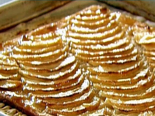 Bake for 45 minutes to 1 hour, until the pastry is browned and the edges of the apples start to brown. Rotate the pan once during cooking. If the pastry puffs up in one area, cut a little slit with a knife to let the air out. Don't worry! The apple juices will burn in the pan but the tart will be fine! When the tart's done, heat the apricot jelly together with the Calvados and brush the apples and the pastry completely with the jelly mixture. Loosen the tart with a metal spatula so it doesn't stick to the paper. Allow to cool and serve warm or at room temperature.