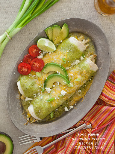 To assemble enchiladas: Place about ⅓ cup chicken mixture along bottom third of tortilla and top with ¼ cup of shredded cheese. Carefully roll tortilla and place it seam side down in the baking dish. Repeat placing tortillas side by side until you've run out of space. Pour avocado cream evenly over the tortillas and spread 1 cup cheese on top.