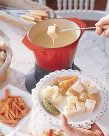 For an hors d'oeuvre, everyone dips into cheese fondue -- a dish with Swiss origins.