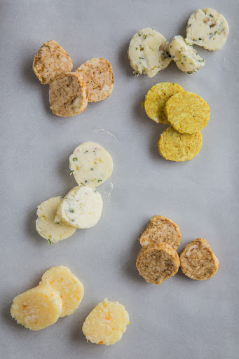 You can definitely serve the compound butter soft and spreadable after it’s freshly made. However, I prefer to form it into logs with plastic wrap and pop it into the refrigerator. Just spread a piece of plastic wrap out and scoop the softened butter mixture on top. Use the edges of the plastic wrap to fold over the butter and then use your hands to form it into a skinny log. Twist the ends and chill until firm. The butters will last for 5 days in the fridge or up to about 6 months in the freezer. To freeze, slice the log into small discs and place them into a freezer bag. Be sure to label the bag with the flavor of the compound butter and the date for future reference. Frozen compound butter can be used straight out of the freezer. Just pop it onto some hot corn and it will melt beautifully.