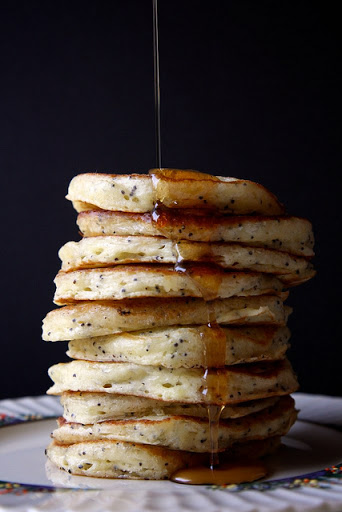 In a separate bowl (or you can use a large liquid measuring cup), whisk together buttermilk, eggs, vanilla extract, lemon juice, and melted butter. Pour the wet ingredients all at once into the dry ingredients. Add the poppy seeds and stir to combine. If a few lumps remain, that’s no problem. Let the batter rest for 10 minutes while the griddle heats.
